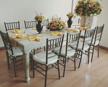 Nuestras sillas, mesas y cristalería aportan estilo, confort y armonía a cada espacio, creando escenarios memorables para uno de los días más importantes de tu vida. Nos encargamos de la entrega y logística, para que todo esté listo a tiempo y sin preocupaciones.
